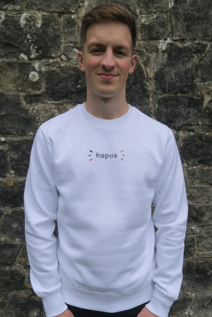 Our Unisex Embroidered 'Hapus' Sweatshirt in White.